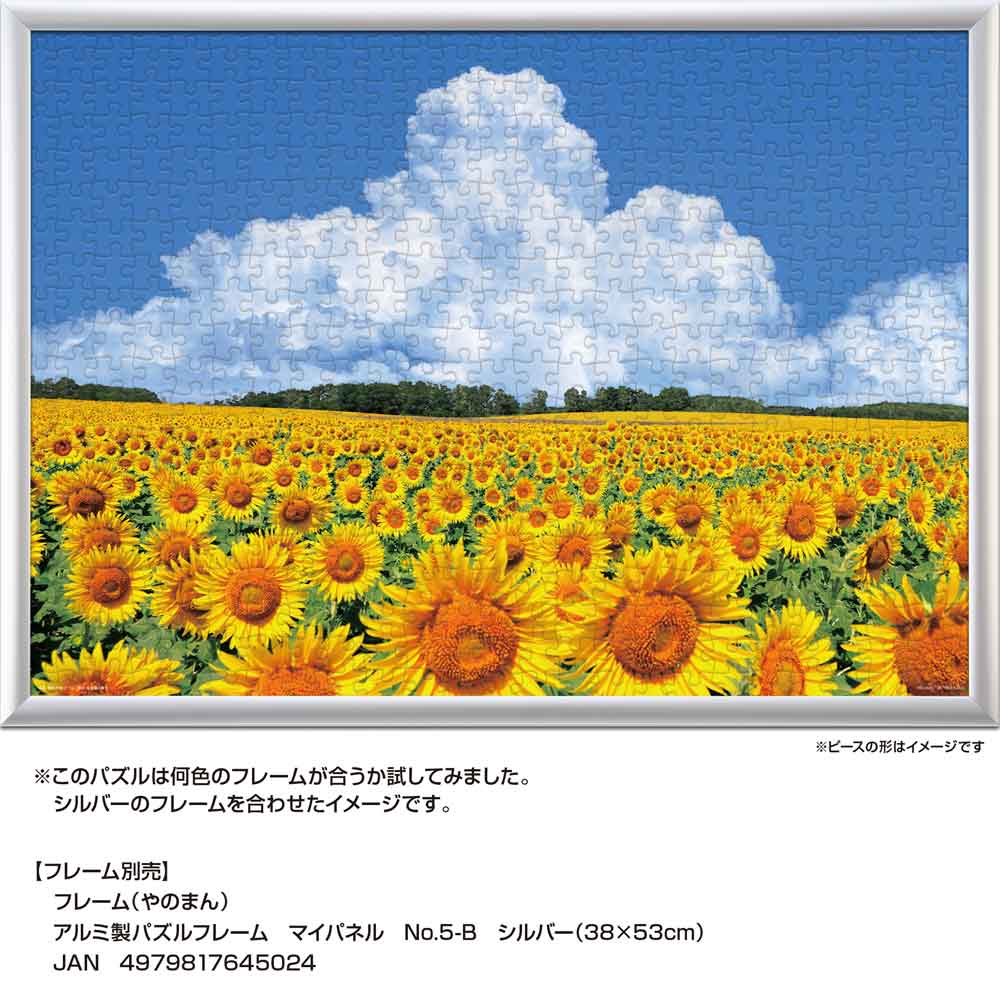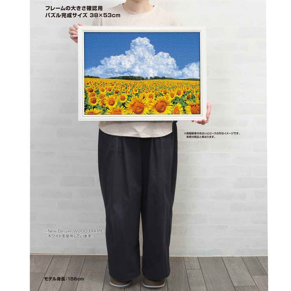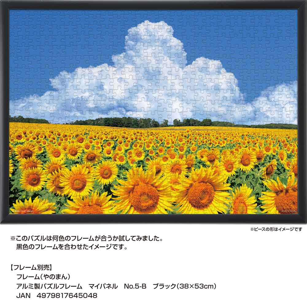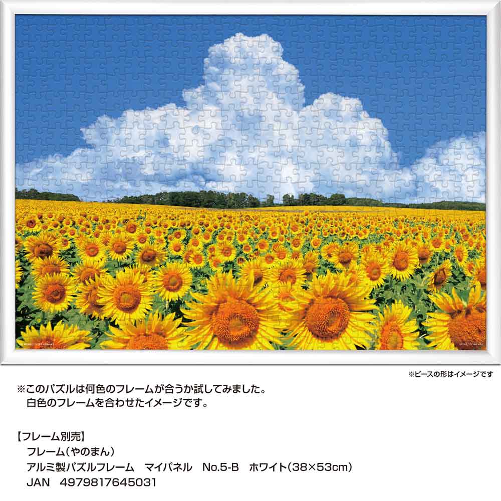 北海道北竜町に広がるひまわり畑の夏景色を切り取った一枚です。青空の下、見渡す限りに咲き誇るひまわり畑と、空高く湧き立つ入道雲が美しい調和を生み出します。自然の雄大さと季節の彩りが、完成後の空間に明るさと開放感をもたらします。