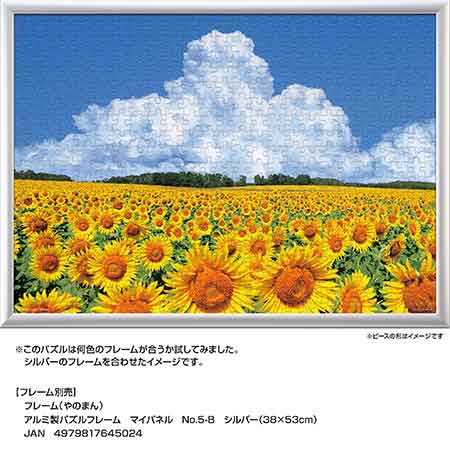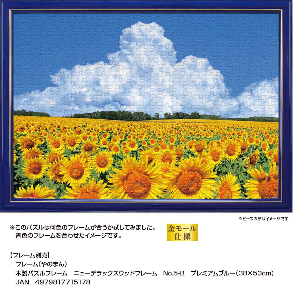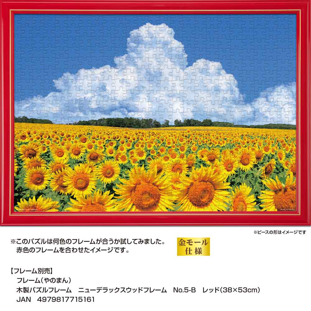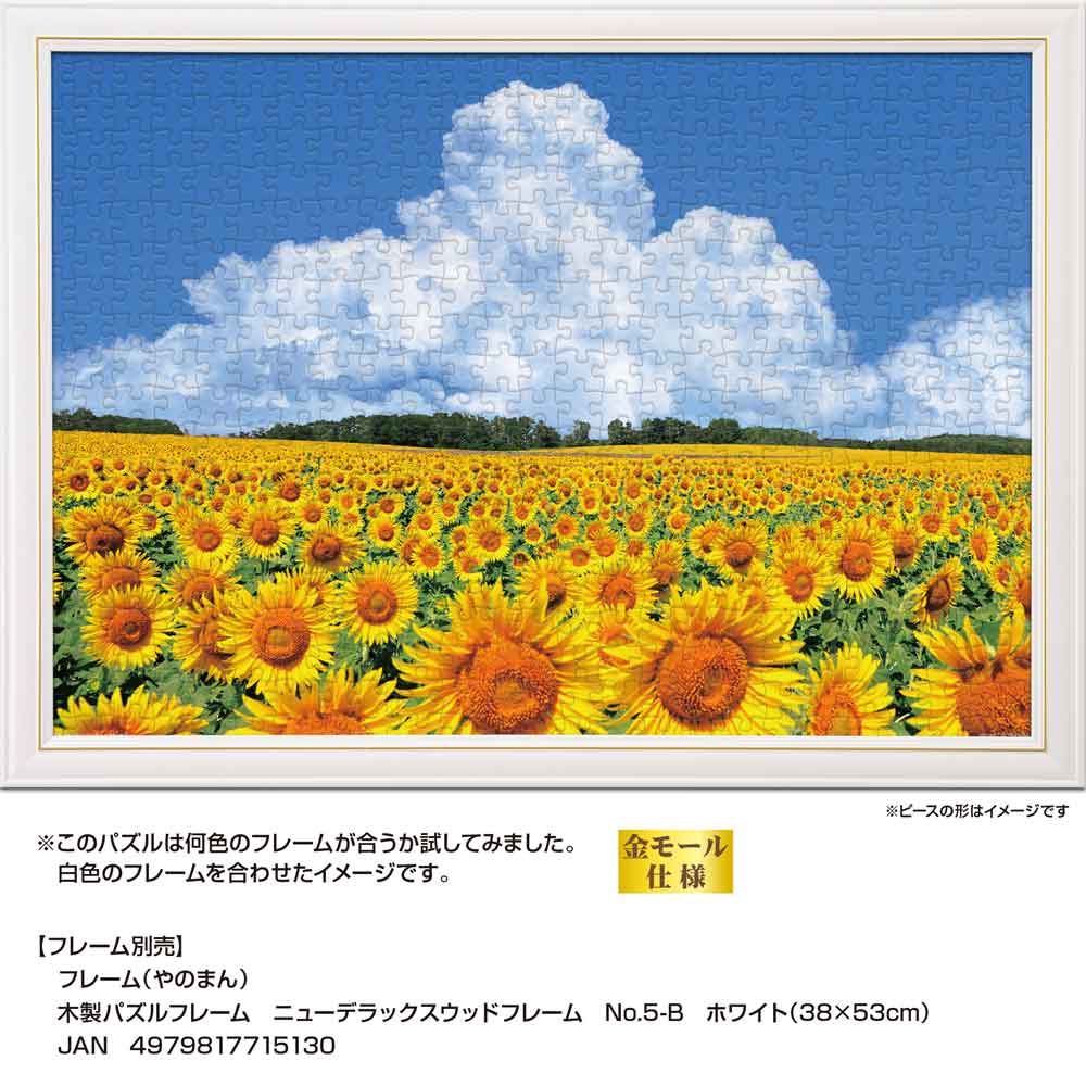 北海道北竜町に広がるひまわり畑の夏景色を切り取った一枚です。青空の下、見渡す限りに咲き誇るひまわり畑と、空高く湧き立つ入道雲が美しい調和を生み出します。自然の雄大さと季節の彩りが、完成後の空間に明るさと開放感をもたらします。