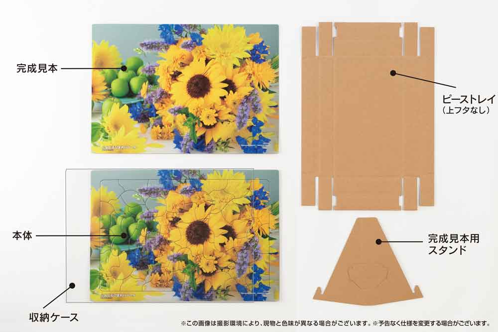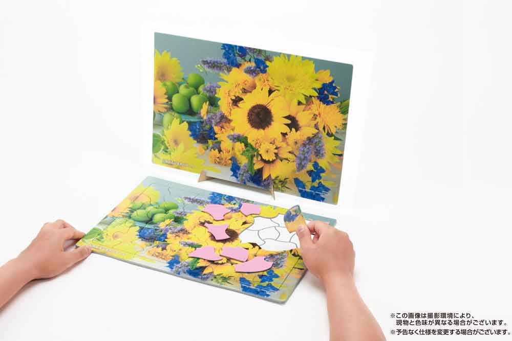 元気に咲くひまわりと涼しげな青い花々が、心をおどらせるような爽やかで明るいブーケです。●高齢者の方々のこころとからだの健康の為に介護の現場から生まれたジグソーパズルです。ジグソーパズルは脳と手先を使うことから、右脳活性化に効果があるといわれています。こうした特性を介護の現場でもっとお役立ていただけるよう、高齢者の方専用に開発しました。●付属品:完成見本・完成見本用スタンド・収納ケース・ピーストレイ ●商品形態:台紙付パズル(完成された形での納品となります)