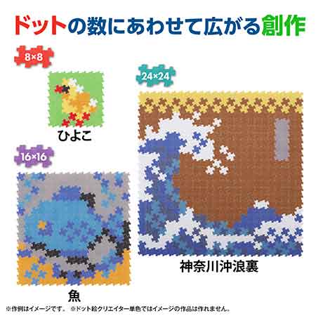 ドット絵クリエイターは上下左右の4辺すべてに同一の凹凸(おうとつ)を持つ特殊なドットです。このドットの凹凸を隣り合わせに組合わせていくことで、自由な絵を作成することが出来るツールです。色とりどりのピースを繋げ、まるで色を塗るように絵を描くことが出来ます。内容物:ドットピース80個入り、サイズ:1ドット2cm