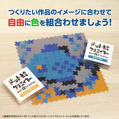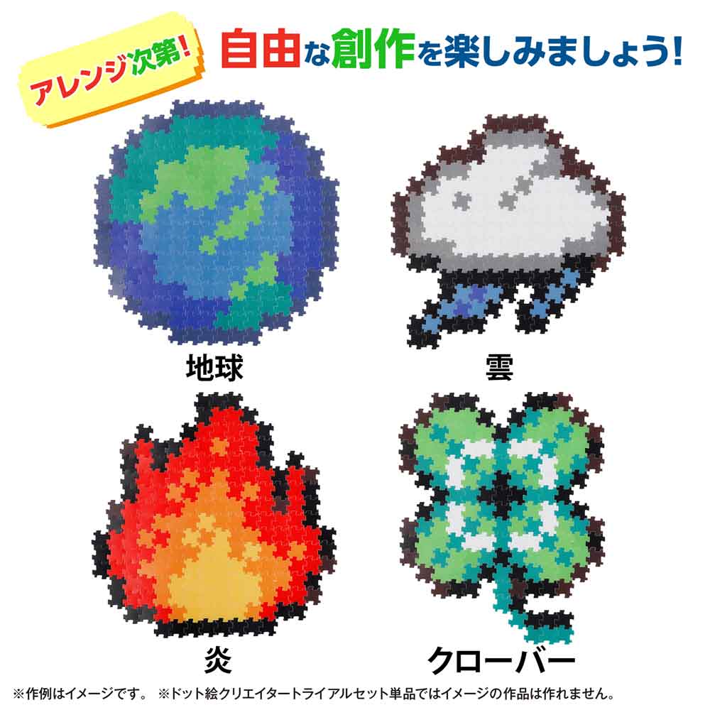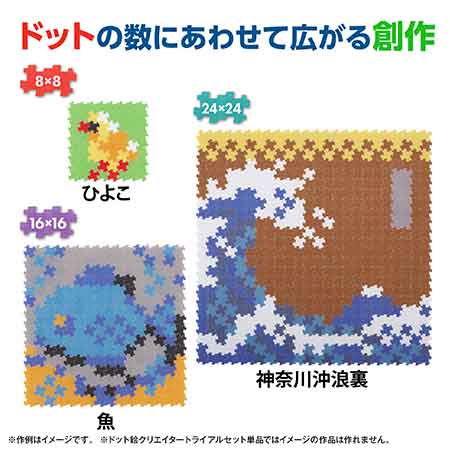 ドット絵クリエイターは上下左右の4辺すべてに同一の凹凸(おうとつ)を持つ特殊なドットです。このドットの凹凸を隣り合わせに組合わせていくことで、自由な絵を作成することが出来るツールです。色とりどりのピースを繋げ、まるで色を塗るように絵を描くことが出来ます。内容物:ドットピース80個入り、サイズ:1ドット2cm