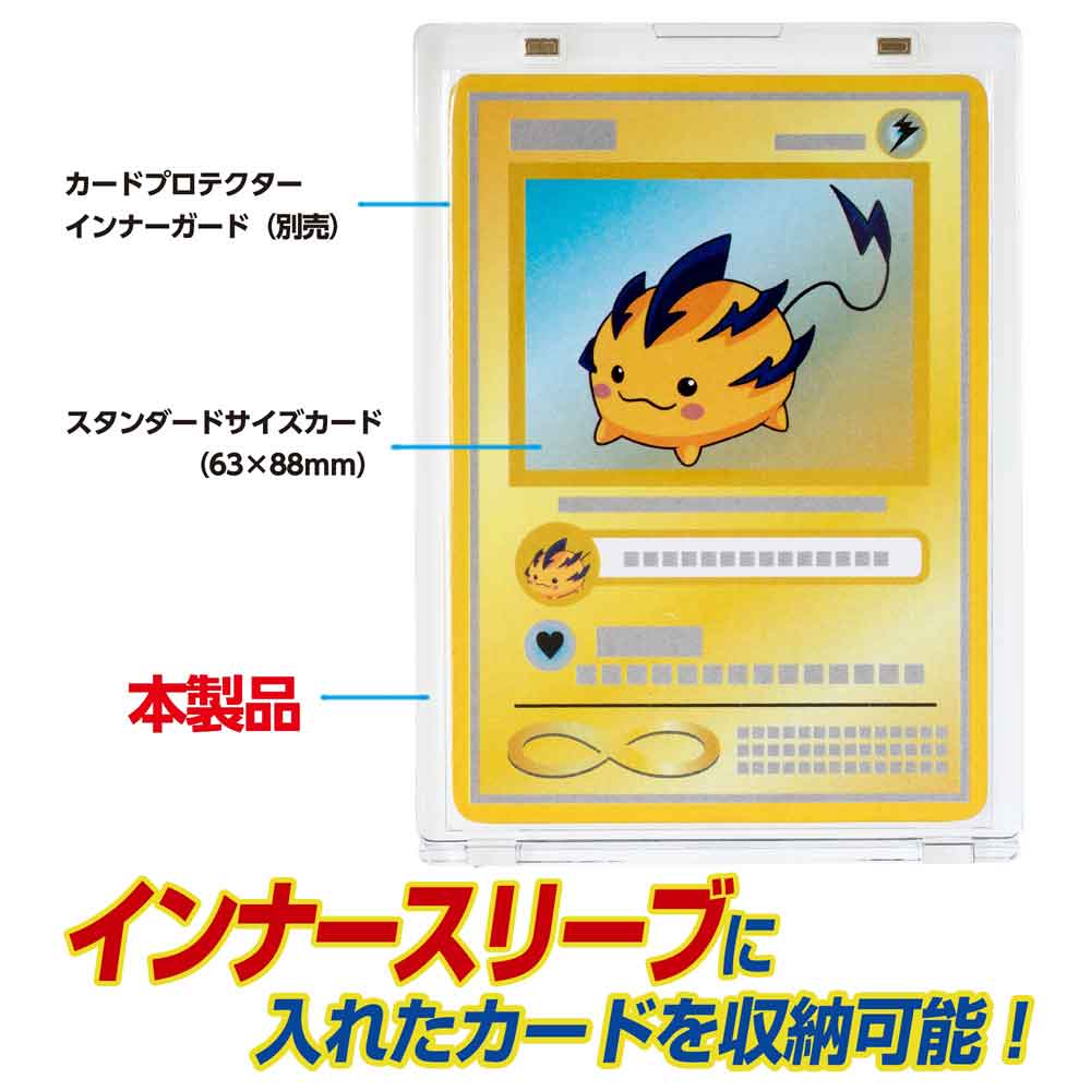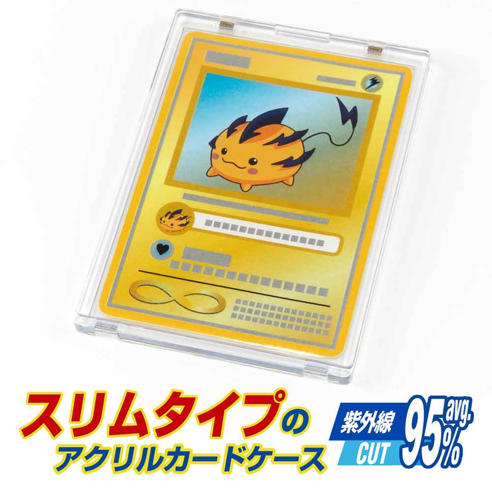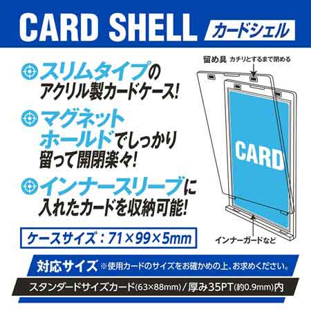 スタンダードサイズカード(63×88mm)対応のアクリルカードケースです。●アクリル製なので強度、透明度共に高く、紫外線を平均95%カット、中のカードをしっかり保護します。●サイズ71×99mm、厚さわずか5mmでデッキケースに入れることもできるスリムタイプ ●カードセット部分の深さは0.9mm(35PT) ●インナースリーブに入れたスタンダードサイズカードを収納可能!●留め具はマグネットでしっかり留まって開閉楽々!●中国製 ※予告なく仕様を変更する場合があります。