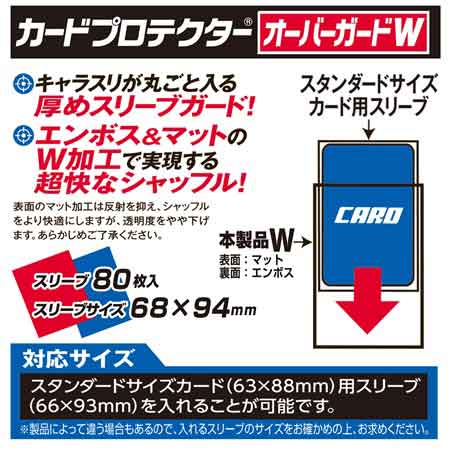 シャッフルのしやすさに特化した厚めスリーブガードです。表面:マット/裏面:エンボスのW加工が超快なシャッフルを実現!スタンダードサイズカード(63×88mm)スリーブ用でキャラスリーブなどを丸ごとガードします。※表面マット加工は反射を抑え、シャッフルをより快適にしますが、透明度をやや下げます。あらかじめご了承ください。●パック入数:スリーブ80枚 ●スリーブサイズ:68×94mm ●中国製 ※予告なく仕様を変更する場合があります。