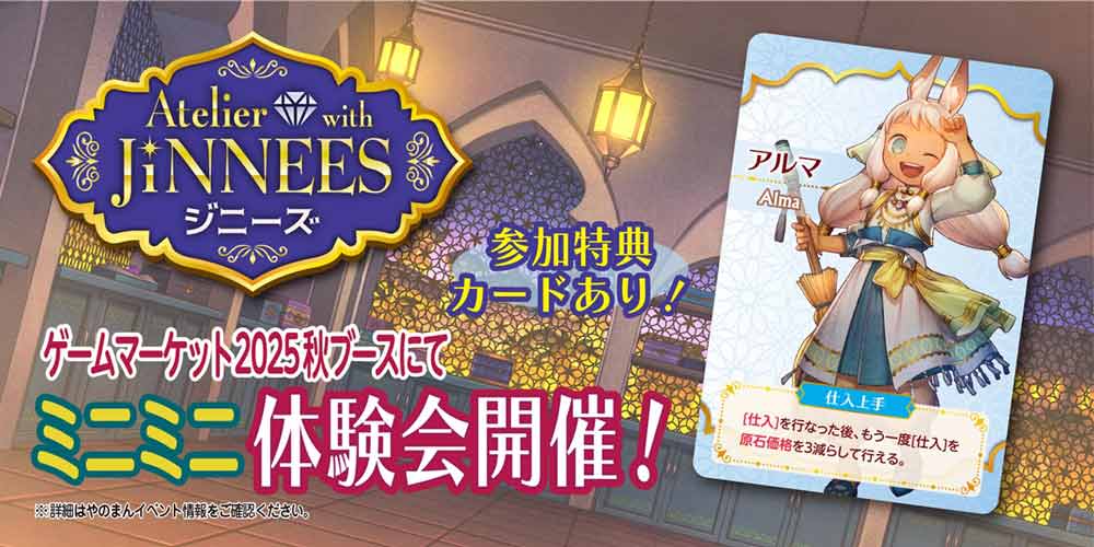 『アトリエ・ウィズ・ジニーズ』のインストとプレイが楽しめる体験会を開催いたします。総席数8席という本当にミニミニな体験会ですが、参加特典カード〈アルマ〉(開店前Ver.)もご用意しております。興味がある、一度遊んでみたいという皆様、ぜひ振るってご参加ください。