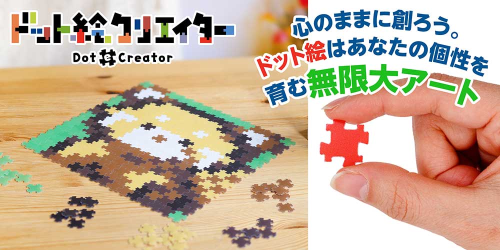ドット絵クリエイターは株式会社やのまんがジグソーパズルの製造技術を活かして開発したドット絵(pixel art)を作成することが出来るパズルピースです。ピース形状はすべてが同じ形(相似形)ですので様々な色のドットピースを組み合わせてドット絵を創ることが出来ます。自由な発想で創造した自分だけのドット絵をアート作品としてお部屋に飾ってみてはいかがでしょうか。